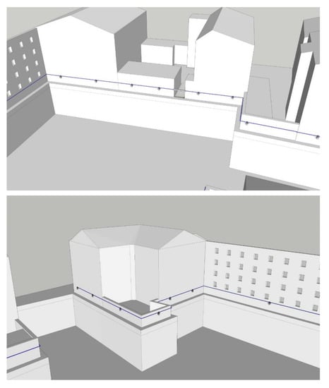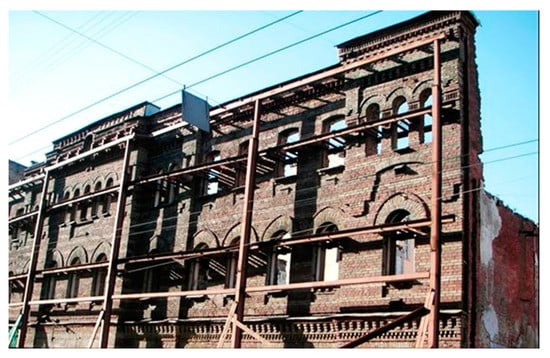 In many building revitalization projects, the existing brick or stone façade is kept and is temporarily supported by a steel structure while the rest of the building is demolished. In the internal space, a new supporting structure of the building is erected, and then adapted to the modern technical requirements and the expectations of future users. The façade walls are anchored to the new support structure and carefully restored. In this way, the appearance of the building does not change, but its usability is significantly improved. However, before this happens, the stability of the walls, often of considerable height, must be supported during the process of construction. The support may be realized by means of horizontal steel ties made of bars and located on several levels, or by means of stiffening or bracing elements [,].