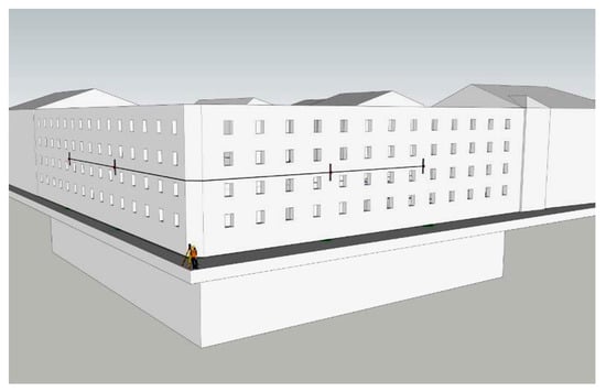 The system is characterized by high accuracy measurement and was designed to measure the vertical movement of structural elements. Its measuring range applies to displacements of up to ±500 mm. The mounted sensors create a map of the 2D measurement network, which can then monitor the vertical displacements of the structure over the entire surface. Contour line plots can be generated over time to directly detect which area should be analyzed. All the sensors of the system are connected to each other with the same liquid pipe and then connected to the liquid expansion tank, which is located above the entire measuring system. This method of system construction allows the appropriate pressure to be forced inside. The vertical displacements of individual sensors mounted on the structure cause pressure changes inside the system, which are measured in the place of the installed sensors. When the sensor moves vertically, the corresponding liquid height changes accordingly, independent of all the other sensors. As liquid pressure can be measured very accurately at each sensor, vertical movement can be calculated from the density of the used liquid. Each sensor is also connected to each other sensor by an air pipe in order to normalize the reference pressure between the sensors. When the structure settles down, the measuring cells settle with the structure, in turn increasing the pressure in the system. Therefore, a settlement measurement can be performed. Lifting of the structure is similarly detected, i.e., when the liquid pressure in the system is reduced. The HLC system is fully integrated with the software system, e.g., the Quickview interface. Data is streamed online within minutes, so movements of the structure can be monitored in real time. Supervision over the measured structure is clearly achieved by means of a simple graphic visualization and automatically generated reports. If the measurement shows that the displacements of the structure have exceeded the previously set alarm thresholds, the system can send automatic notifications. An example of an HLC system application is shown in Figure 6, Figure 7 and Figure 8. This system was installed along the facades of buildings and around the planned earthworks (excavations) related to the revitalization of a historic hotel building in the center of Wroclaw.