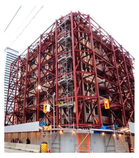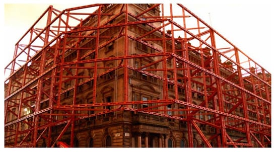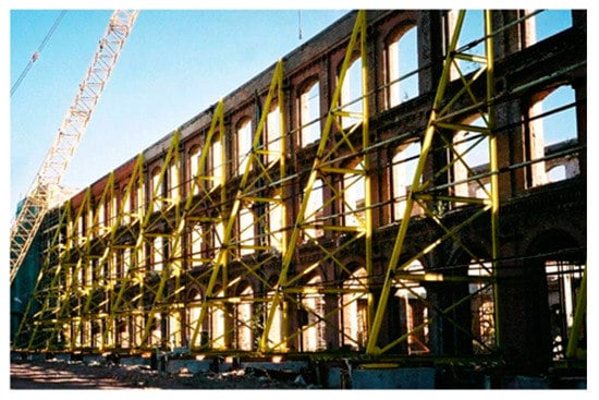 Examples of supporting an existing masonry façade wall with an external temporary steel framework are shown in Figure 11, Figure 12, Figure 13 and Figure 14. Figure 11 shows the temporary supporting structure for the façade of a revitalized textile factory building that is having its function changed into a cultural, recreational, and commercial center. The supporting structure is anchored to concrete blocks.