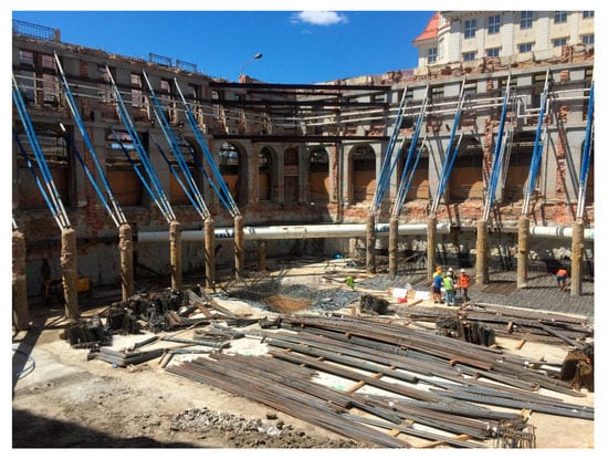 It has recently become general practice to use small building plots located in dense urban housing. In such places, infill buildings are constructed, or historic buildings are revitalized using their façade walls for the construction of new objects [,]. In both cases, the construction projects involve deep excavation work. During the construction of infill buildings, these excavations can cause serious damage to existing buildings located in the surrounding neighborhood. However, when erecting a building that uses historic façade walls, the excavations have an impact on the structure of these walls and their foundations []. As a result of ground deformations additional forces are generated in the elements and their connections as well as additional deformations and displacements. It is the horizontal and vertical displacements of existing structures that are an important factor when assessing the degree of risk of structural collapse. The inclination of the building from the vertical axis is usually allowed up to a value of 3 per mille [], and its settlement to a value ranging from 5 to 15 mm []. Inclinations of existing buildings from their vertical axis cause additional horizontal forces (which are the components of vertical loads) in the elements of the structures. The horizontal forces that act on the entire structure must be transferred by its load-bearing systems under the required conditions of stability and strength, or by external designed supports.