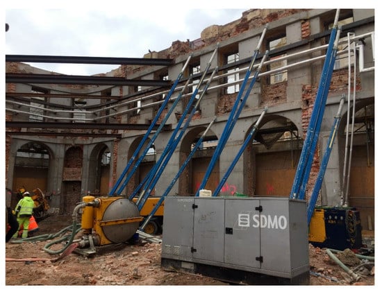 - Gordon, A.; Sousa, M.; Isherwood, B. Heritage Facade Support and Excavation Shoring—A Micropile Case History. In Proceedings of the 13th International Workshop on Micropiles, Vancouver, BC, Canada, 29 March–1 April 2017; pp. 1–19. [Google Scholar]