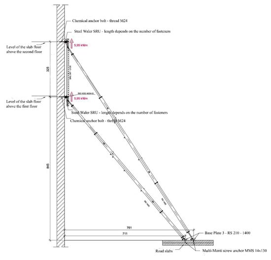 A disadvantage of such solutions is the high consumption of steel, but also the time-consuming implementation, which can be essential when you need to quickly support a wall. An alternative solution that can be used in such cases is presented below. It also uses the PERI Push-Pull Props system [], which is fastened on one side to the supported wall, and on the other to e.g., reinforced concrete road slabs laid at the bottom of the excavation. The proposed solution, which is currently being implemented at a historic tenement house in a city center location, is shown schematically in Figure 19. This solution enables the wall support to be made almost immediately.