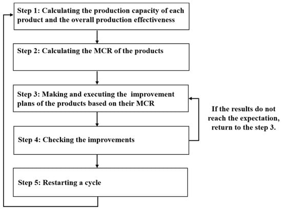 - Difficulties in continuous improvement of the production system. It is reasonable to diagnose the negative factors which lead to the losses in the production system and propose the countermeasures to the managers in order to improve the overall production system continuously []. However, the negative factors in the multiproduct production system cannot be reflected by former measurement methods sufficiently since these measurement methods did not take into account the complex manufacturing process in the multiproduct production system. As a result, the negative factors in the system are difficult to find [] and related managerial enlightenments are hardly indicated, which is not beneficial to the continuous improvement of the multiproduct production system.
