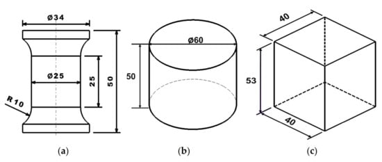 Dimensions of test specimens for: (a) tensile test; (b) compressive test; (c) pull-out test.