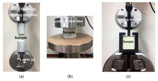To obtain the tensile and compressive stress-strain curves of the PUR foams, the tensile and compression tests have been carried out three times, since they tend to show totally different material behavior in the tensile and compressive deformation modes with respect to the density of the porous material []. Figure 2 demonstrates the detailed dimension of test specimens for tensile, compressive, and pull-out tests based on the ASTM D 1623 and ASTM D 1621 standards, respectively. In the case of the tensile specimen, a pre-machined part from the PUR block as depicted in Figure 2a is attached to a cylindrical grip with a diameter of 34 mm by applying with the metal adhesive, which is set in the universal testing machine as shown in Figure 3a. The tensile tests are carried out with a head speed of 1mm/min to guarantee the quasi-static strain rate.