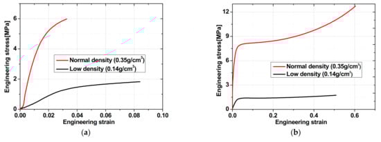Figure 4 represents the experimental results of the tensile and compressive tests with respect to the densities of PUR foam. The compressive strength of the lower density specimen exhibits about 17% of the normal density specimen, as depicted in Figure 4b, while the tensile strength of the lower density specimen exhibits about 30%, as shown in Figure 4a.