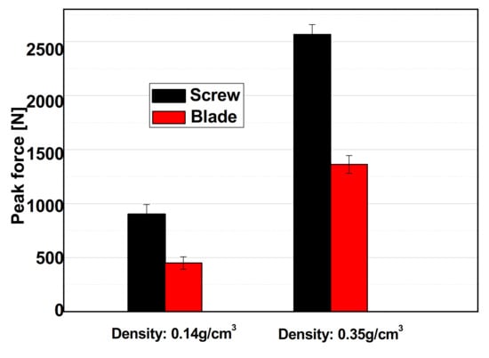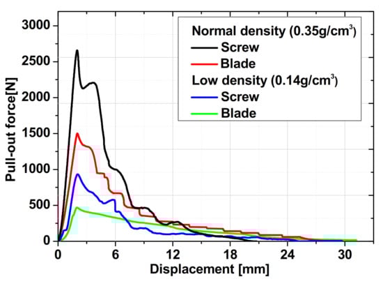 Pull-out tests with helical blade and screw were conducted with respect to the PUR foam density for three repeated tests to guarantee reproducibility. Figure 5 compares the experimental reaction forces from the pull-out tests in which screw-type shows substantially higher reaction force than helical blade independent of the foam density. After the first peak occurs, the pull-out force rapidly decreases since the contact area between the screw or helical blade and the PUR foam decrease. Since there is a lot of debris observed in the screw thread after pull-out tests as depicted in Figure 6a,c, it is evaluated that the screw-type tends to induce severe damage to the PUR foam during the pull-out process even though it is able to guarantee sufficient clamping force. In terms of the peak loads in the pull-out test, the screw-type demonstrates higher clamping forces of 177 7% in the normal-density foam and 198 13% in the low-density foam, as seen in Figure 7.