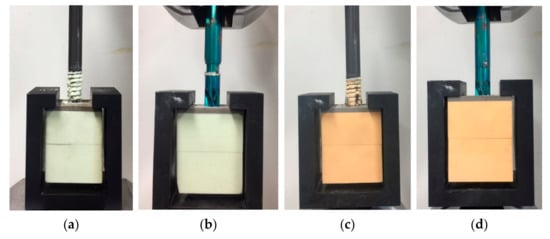 In the pull-out test, a screw and helical blade are inserted, first, into a pre-machined parallelepiped block with dimensions of 40 × 40 × 53 (mm3), which is set in the specially designed fixture to conduct the pull-out test as shown in Figure 3c. The pre-installed screw or helical blade is pulled upward with the speed of 5 mm/min until the final failure occurs, and the pull-out load is measured to examine their pull-out performance. To visually evaluate the strain distribution of the specimen during the tensile and compression tests, the digital image correlation (DIC) technique is applied by utilizing the ARAMIS system [].