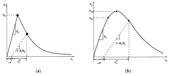 Similar to Equation (5), the tension damage, , depends on , which is expressed in Equation (6) [].