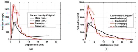 Comparison of pull-out forces between experiment and FEM analysis with screw and helical blade: (a) normal density (0.35 g/cm3); (b) low density (0.14 g/cm3).