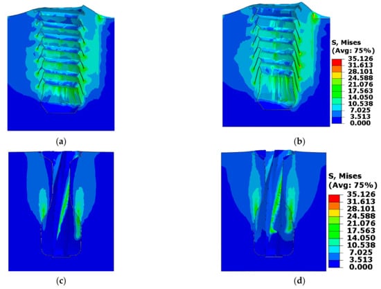 Distribution of von Mises equivalent stress (MPa) with increase of pull-out stroke in normal foam density (0.35 g/cm3): (a) screw at pull-out stroke of 4 mm; (b) screw at pull-out stroke of 6 mm; (c) helical blade at pull-out stroke of 4 mm; (d) helical blade at pull-out stroke of 6 mm.
