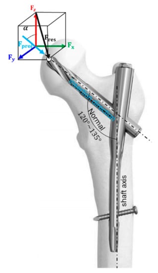 Bergmann et al. [] have directly measured the contact force on the femoral head according to various types of activity such as walking, stance, and jogging, etc., which were expressed in terms of x, y, z coordinates. To evaluate the critical pull-out force physically, it is necessary to project the contact force (Fres) along the insertion direction as shown in Figure 13. Using Equation (7), projected force, Fproj, is calculated along the insertion direction. Then, stable fixation against screw or helical blade migration is guaranteed when the pull-out force, Fpull-out, from Figure 5 is larger than Fproj.