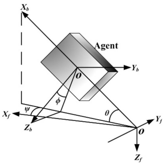 In this paper, we mainly focus on the 3D real-time trajectory planning of the kind of space-based robots, such as SPHERES [38] and astronaut assistant robots [39]. The agent can work in a space station or specific working range in which the flying distance is much shorter than the radius of the orbit. In addition, the algorithm can also be extended to other types of agent 3D trajectory planning. This section provides the mathematical model of the motion and the attitude of the spatial agent. In a 3D environment, the attitude of the agent is represented by the pitch angle θ, yaw angle ψ, and roll angle ϕ, as shown in Figure 1. Under reference coordinate system (Xf, Yf, Zf), the equation of the agent’s motion is written as: