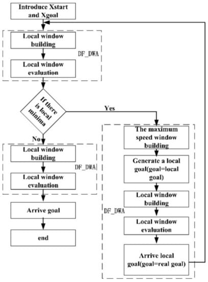 Based on fuzzy rules, if the minimum value of the input obstacle distance is set larger, the agent’s reaction time for obstacle avoidance will be earlier. Meanwhile, the minimum value of the εspeed and εheading fuzzy domain is not set to zero, which can prevent the agent from falling into local minima because of the slow velocity. The specific steps of DF_DWA algorithm are as follows.