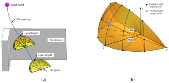 where goallocal(i) is the candidates for local points, ϕi(t) is the azimuth of the candidates for local points. θi(t) is the elevation of the candidates for local points, X(t) is the position of the agent, and RS is the safe separation of the agent and obstacles. j, k and m are the index and number of the candidate local goals. The larger the value of m is, the more local goal points can be selected, and the better the optimization result of the local goal can get. RS is defined by: