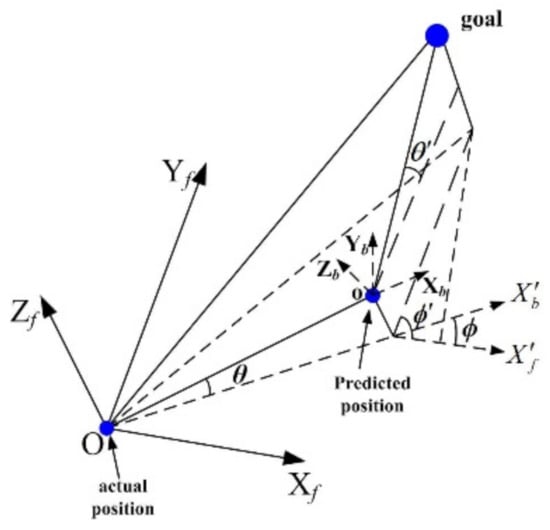 This heading term prizes the curvature arcs that head the agent towards the goal. The direction angle between the end of the trajectory and the goal is compared with the azimuth of the agent (i.e., ϕerror, θerror). As shown in Figure 6, the ϕerror and θerror can be given by: