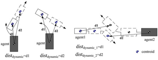 In this section, the agent can detect the location of other agents by sensors and calculate the distance between them [19,33,42]. When using DF_DWA, although the speed does not change much, it is not constant. Therefore, the safety distance between obstacles must be strictly ensured. In this paper, the current maximum window speed is used to calculate the braking distance (i.e., Rbraking).