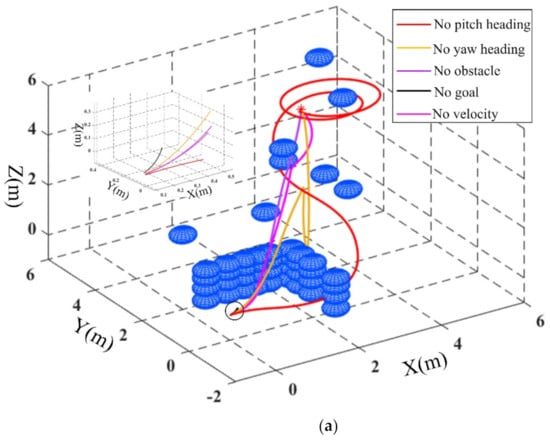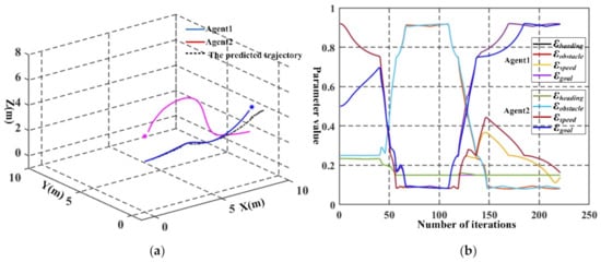 It can be seen from Figure 13b that the parameter εspeed is set as a predominant weight when the two agents are far apart initially. As the two agents approach each other, the weight of the εobstalce gradually increases. When the agents reach the obstacle avoidance range, the weight of the εobstalce exceeds 0.9. After escaping the threat posed by one another, the first task of each agent is to reach its goal. Therefore, εgoal gradually increases. When the goal is about to be reached, the weight of the agent speed should be decreased to prevent the agent from passing over the goal while traveling at an extremely high speed.