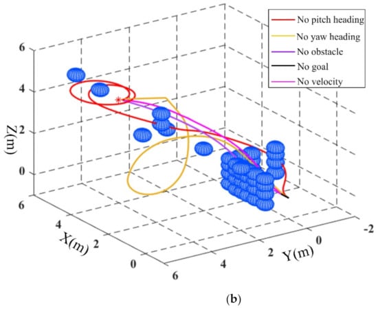 To further test the obstacle avoidance ability of the algorithm in a dynamic environment, we set up a scenario in which two agents move to each other and are obstacles to each other. As shown in Figure 13a, the starting point of Agent 1 is (0,0,3). The goal point of Agent 1 is (8,0.5,5). The starting point of Agent 2 is (8,0,3). The goal point of Agent 2 is (0,0.7,5). It is observed from the test result that this situation is safe in that Agent 1 moves upward and Agent 2 moves downward when the separation of the two agents is short. The black dotted line is the predicted trajectory of Agent 2 to Agent 1.