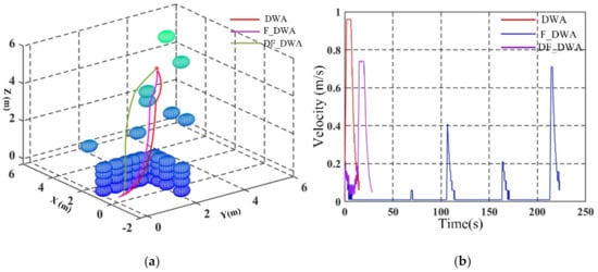Figure 12a shows the trajectories planned by the three methods. Figure 12b shows the velocity change of the agent. Table 7 shows the number of iterations and the minimum distance between the agent and obstacles. In terms of the time spent in planning the trajectory, it can be seen from Figure 12b and Table 7 that it takes the most time when using F_DWA to plan trajectory, and DWA spends the least time in planning trajectory. Regarding the safety factor, it can be seen that the trajectory planned by DF_DWA is the farthest from obstacles, so the trajectory is the safest. The minimum distance between the trajectory planned by DWA and obstacles is 0.28mm, less than the safety distance of 0.3 mm, meaning that although agents can reach the goal with the least time when following the DWA planned trajectory, the safety is lowered. F_DWA takes the most time to plan the trajectory because of the velocity falling into the local minima many times. Therefore, DF_DWA is superior to F_DWA and DWA in terms of computational efficiency and safety.