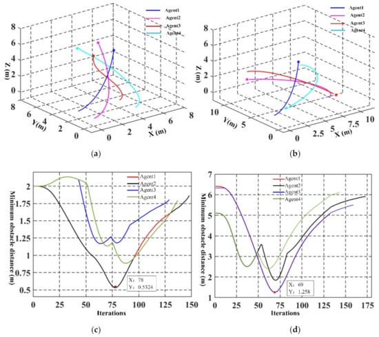 Dynamic obstacle avoidance: ((a) four agents flying to the same plane; (b) four agents crossing each other; (c) the minimum obstacle distance between the agents at the same moment during the iterations in FFLSP scenario; (d) the minimum obstacle distance between the agents at the same moment during the iterations in FFCL scenario).