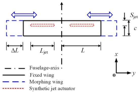 To address the poor control efficiency of an aileron at a high AoA, SJA and the morphing span are proposed to achieve the roll control of aircraft. The structural model of morphing aircraft with arrays of actuators is shown in Figure 1, where the fuselage-axis is the axis of symmetry itself. The morphing wing is installed at the tip of the fixed wing, and SJA is located at the middle of the semi-fixed wing, along the spanwise direction. The lengths of the fixed wing, the morphing wing, and the array of SJA are L = 5 m, ΔL ∈ [0, 1.12 m], and Ljet = 3 m, respectively. The chordwise position of the actuator in this study was set as Sjet = 0.12 m, and the chord length as c = 1 m.