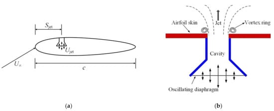 A synthetic jet is created by driving the piezoelectric diaphragm at the bottom of the cavity in a periodic manner, as presented in Figure 2b. During oscillation of the membrane, the jet is synthesized and a shear layer is formed by the interaction of pairs of opposite vortex rings at the orifice and the surrounding fluid. The synthetic jet with zero net mass flux, which only requires electrical power, can generate a nonzero momentum [25,26]. Therefore, it can be used for active flow control at a high AoA [27]. Here, an optimized cavity shape with a better performance proposed in our previous work is employed, as shown in Figure 2b [28].