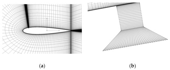 The unsteady aerodynamic force for SJA is calculated by the commercially available code CFD++, which employs the Reynolds-Averaged Navier–Stokes (RANS) equation and Shear Stress Transport (SST) model. The C-grid about the airfoil and the structured mesh of the cavity are generated as shown in Figure 3. To weaken the influence of numerical reflection from the far-field boundary and get a better solution, the computational domain is set as 40 c × 40 c. Furthermore, the meshes near the wall, trailing edge, and cavity are clustered. The widths of the orifice and bottom are 0.52% c and 1.56% c, respectively, and the depth of cavity is 1% c. Let the free stream velocity U∞ be 34 m/s and the Reynolds number Re based on airfoil be 1.9 × 106. The total number of the grid is about 23,000, the height of the first layer of the grid is 10−5 c, and the value of y+ is 0.8 in this study.