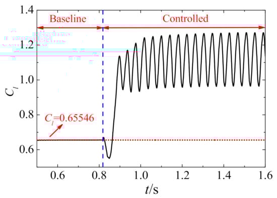In general, the aerodynamic response of synthetic jet-based control is very sensitive to the forcing frequency f, so the aerodynamic lift can be improved by setting the forcing frequency so that it is equal to the vortex-shedding frequency of the airfoil fs, i.e., f = fs = 24.44 Hz in what follows [28]. The effectiveness of synthetic jet-based control is presented in Figure 4, as one can see that the lift coefficient can be increased greatly due to the delay of the separated flow. Here, the free stream velocity and blowing magnitude of the synthetic jet are 34 m/s.