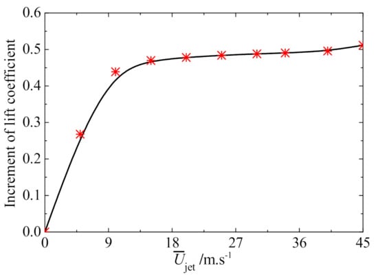According to Figure 5 and the nonlinear least squares method, one can obtain the relationship between the roll moment coefficient Cy,jet and blowing magnitude ,