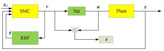 In this section, a sliding mode controller [31,32,33] is designed to track the command signal. The structure of the control system is given by Figure 6, wherein the block SMC refers to the Sliding Mode Controller, and the block RBF is employed to provide compensation induced by the input saturation constraint block named Sat.
