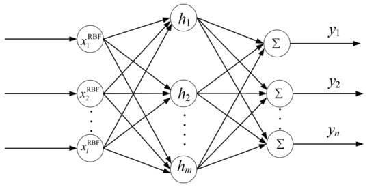 In this work, the input saturation constraint is considered and compensated for via the RBF neural network so as to approximate the nonlinear function in a compact set with an ideal precision [34,35]. Let xRBF be the input of the RBF neural network, i.e., . Then, based on the structure of the RBF neural network shown in Figure 7, one obtains