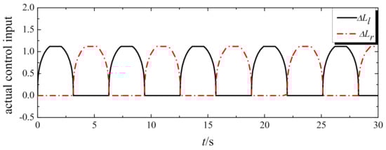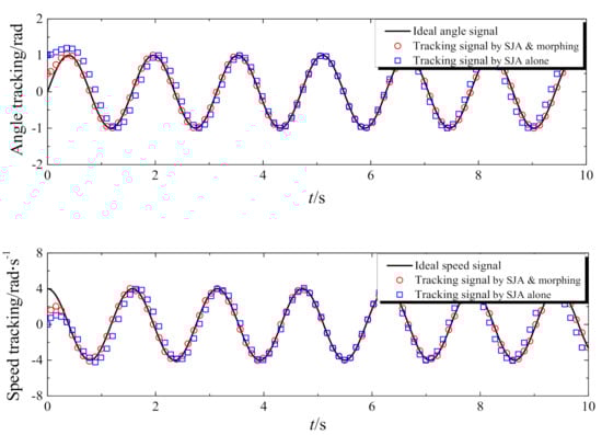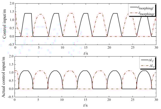 The tracking responses obtained via SJA and the morphing wing are shown in Figure 13. One can see from Figure 13 that the reference signal can be tracked perfectly. Especially when compared with the case controlled by SJA alone, the redundant control input due to morphing can make the tracking response converge to the target more quickly. In addition, the span extends asymmetrically and the curve of morphing in Figure 14 is quite smooth, such that the flight stability during the morphing motion can be guaranteed [5,38].