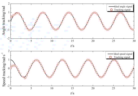 When the morphing wing of the aircraft is not considered, i.e., ΔL = 0, one can find that the synthetic jet-based control for fixed-wing aircraft can effectively track the command signal of roll motion at a high AoA, as shown in Figure 12 and Figure 13, wherein the reference angle signal is set as xd = sin4t. Furthermore, one can conclude that the controller, which takes approximately 0.5 s to reach stabilization, meets the performance requirement and eliminates the influence of the disturbance induced by SJA.