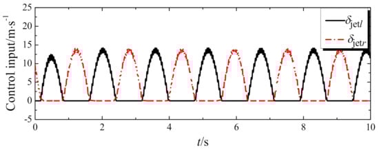 where Cy and Cy,jet are roll moment coefficients caused by the rolling motion and SJA, respectively. Here, the coordinate y along the wing span is as shown in Figure 1, and is the intermediate control input relative to SJA with as coefficients. Subscripts l and r denote the left and right wings, respectively. is the dynamic pressure, S is the surface area of the fixed wing, ωx is the roll angular velocity, and k1 = 0.0258 is a constant when the AoA is around α = 18°. Integrating Equation (2) along the span of the fixed wing gives the roll moment