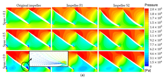 To clarify the optimization mechanism, it is necessary to compare and analyze the internal flow field of the model. The comparison of pressure contours between the baseline impeller and the preferred impellers F1 and S2 at 1.2Qdes and 0.8Qdes are shown in Figure 18. After carefully considering the influence of the wall on the flow field, these data were extracted at , 0.5, and 0.1 respectively. As shown in Figure 18a, at 1.2Qdes, an obvious low-pressure region appeared on the leading edge near the shroud of the baseline impeller, which resulted in a large-scale backflow. After optimization, the low-pressure region was greatly weakened and the backflow was completely suppressed. Besides, the pressure distribution at the inlet of impeller S2 was more uniform than that of impeller F1. Figure 18b also shows the same phenomenon, but it should be noted that the low-pressure region appears on the blade suction surface and that there is no backflow in the low-pressure region.