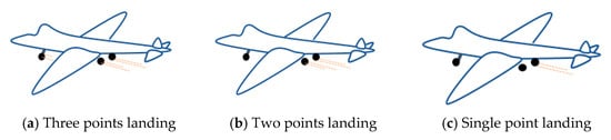 The forces applied on an aircraft are weight, lift, thrust, and drag. The position of the center of gravity may change slightly as fuel is utilized. The magnitude and direction of the lift, thrust, and drag forces always change when the velocity and attitude of the aircraft change. Figure 1 shows the three loading scenarios for the landing gear when an aircraft takes off or lands; the ideal scenario is shown in Figure 1a. All loads are distributed smoothly on the nose gear and the main landing gears (the orange dot lines). However, not all forces applied on the aircraft keep the attitude ideal. For example, accidents may occur in the scenarios shown in Figure 1b, c when side forces applied by wind disturb the attitude of the aircraft. UAVs use one of three landing gear designs: tail wheel type, tandem type, and tricycle type []. The tricycle-type design is used very frequently because it makes the UAV easily maneuverable. Its other advantages include optimal location of center of gravity, evenly distributed weight of UAV, small effect of crosswind, and easy maneuverability. Its disadvantages include increased drag, slightly higher weight, and tendency to damage the nose gear []. Nonetheless, the tricycle-type landing gear was chosen in this study.