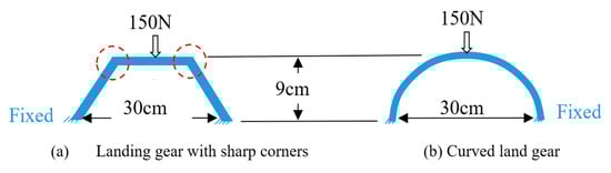 1. Landing gear with a non-curved design has almost two times the stress concentration of landing gear with a curved design. A design without corners is the first choice for the landing gear of a UAV because it must withstand take-off and landing with continuous duty and short-time loading.