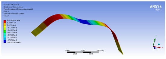 Figure 6 shows the simulation result of maximum displacement of the [0/90]6S design. If the aircraft lands improperly and is subjected to a side force of 150(cos30sin60, sin30, cos30con60) N, the additional loads along the x and z coordinates are borne by the fibers along the transverse directions. Table 5 shows that the axial normal strain ɛxx is minimal with fiber orientations of ±45° in the layers. The zero-degree orientation design still affords good strength against the y displacement and the overall principal strains.