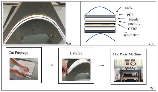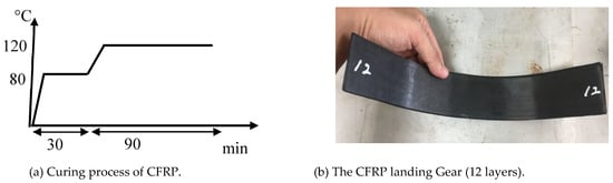 Once the curve of landing gear was defined, a steel mold was produced for compressing the CFRP, as shown in Figure 7a. The schematic description of laminate manufacture is shown in Figure 7b,c, showing the manufacturing processes. As shown in Figure 8a, the standard curing processes are 80 °C for 30 min in stage one and 120 °C for 90 min in stage two. The pressure is kept at 300 psi. At the low temperature in stage one, the CFRP is soft and mixes completely with the epoxy. At the high temperature in stage two, the form shape hardens. Figure 8b shows the final product. The manufacture quality of the landing gear is controlled stably by using the steel mold, and the manufacturing costs are reduced by using a mold that is affordable and allows hot-pressing many times.