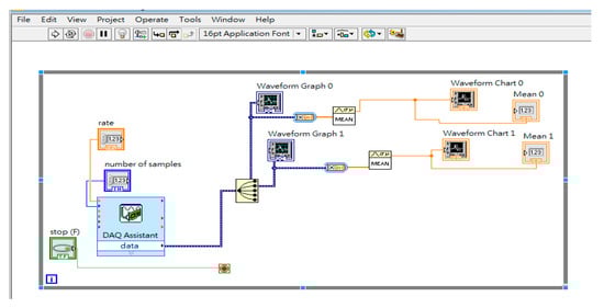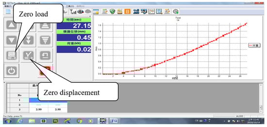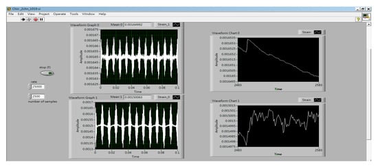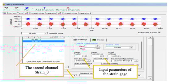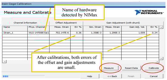 First, the strain gauge with the NI 9237 DAQ card and the NI 9945 adapter needed to be connected. The NI9945 adapter is in the quarter bridge I strain configuration. As shown in Figure 10a, pins 1 and 2 were connected, and the two lines of the strain gauge were connected to pins 0 and 1. As shown in Figure 10b, the adapter signal was sent to the NI9237 DAQ card. Before measuring the signal, the hardware must be detected using NIMax, and the device must be set up based on the manufacturer’s specifications of strain gauge, as shown in Figure 11. The gage factor was 2.06 and the gage resistance was 120 Ω. Calibration must always be performed before conducting the experiments, as shown in Figure 12. The errors of channel 1 were calibrated to less than 1%. Figure 13 shows a block diagram of the LabVIEW program. Figure 14 shows the front panel of strain measurements of the two channels. The data acquisition (DAQ) task was accomplished by strain gain, DAQ device (NI 9237, National Instruments, www.ni.com), and graphical programming language LabVIEW on PC. The virtual instrument of LabVIEW contains two windows: a front panel for the human–machine interface to control the instrument and indicate data, and a block diagram to process data by data flow paradigm. The sampling rate was set to be 25,000 Hz and the number of samples was specified as 2500 points. Every 0.1 s, the mean values of strain were calculated and presented on the front panel in real time.
