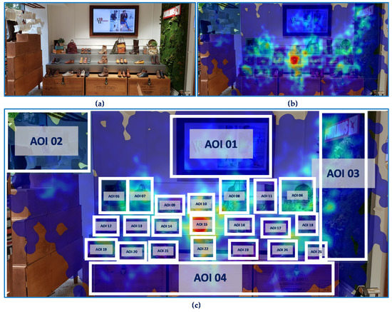 Footwear store area original image (a), heat map (b) and heat map with AOIs (c). Source: Prepared by the authors.