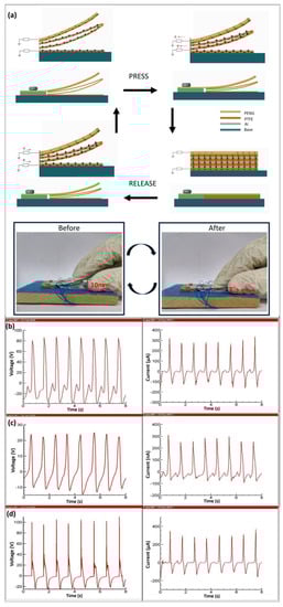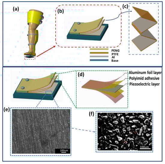 Figure 1a shows a schematic diagram of the application with the entire self-powered multifunctional sensor (SPMS). Figure 1b illustrates the SPMS’ piezoelectric actuators and the zigzag structure of the triboelectric nanogenerator (TENG). The material used is an electrostatic generator composed of polytetrafluoroethylene (PTFE) and aluminum (Al). On top of the SPMS is a piezoelectric nanogenerator (PENG). The size of the SPMS is 5 cm × 4 cm × 1 cm. In addition, the size of the PTFE film is 4 cm × 4 cm × 0.3 mm and the Al film is 4 cm × 4 cm × 0.16 mm. The zigzag-shaped electrostatic generator’s operation schematic diagram is presented in Supplementary Information Figure S1. Figure 1c illustrates a schematic diagram of the multilayered TENG with three basic contact-separation units in the amplified view. A 0.3 mm thick, 4 cm wide PTFE film and a 0.16 mm thick, 4 cm wide Al film are formed in a zigzag configuration and adhesively bonded with a copper tape electrode. Figure 1d is a schematic diagram of the structure inside the piezoelectric actuation of the PENG. The entire structure is beneath 304 stainless steel actuators, which also serve as the spacers in the SPMS for dynamic recovery. Lead zirconate titanate film (PZT) is the material of the piezoelectric layer in the middle of the structure with a thickness of 0.2 mm. In addition, the device uses a material called Thunder® (Face International Corporation, Norfolk, VA, USA), which consists of a layer of polyimide adhesive on the upper and lower parts with a thickness of 25.4 um. The outermost layer is coated with a layer of aluminum foil with a thickness of 25.4 um, which is formed when the composite laminate is heated under pressure to temperatures that allow the adhesive to bond and then cooled to room temperature [37].