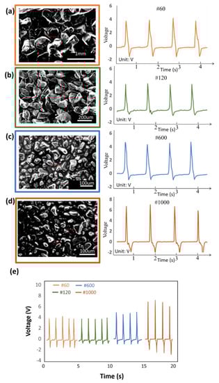 Figure 3a presents #60 grit sandpaper, which was used to grind the PTFE surface as a triboelectric layer microstructure. The sandpaper had a coarse grit size with an average diameter of about 269 µm and the voltage output was about 3.9 V. The surface of the #120 grit sandpaper is shown in Figure 3b. The average diameter of the grit on the sandpaper surface was 115 µm. The data graph shows the voltage output was 3.8 V. As shown in Figure 3c, #600 grit sandpaper had an average grit diameter of 25.8 µm. The measurement chart shows the voltage output was approximately 4.5 V. Micromorphology of the #1000 grit sandpaper is presented in Figure 3d; it had a uniform surface with a grit diameter of 18.3 µm; it had the best voltage performance with a value of 6.6 V. The comparative test was set to measure the output of a single triboelectric layer. As shown in Figure 3e, the triboelectric output of the surface roughness test increased with smaller grit size. The reason is that the smaller the surface structure is, the larger is the total contact area compared to the surface with a larger-scale structure. The triboelectric layers’ contact area will make the triboelectric voltage output perform better.