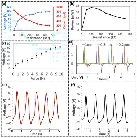 (a) Current and voltage output under different external load resistance. (b) Power output data. (c) The relationship between the applied force and the electrical voltage of the SPMS. (d) The voltage output comparison of the sensor by using different thicknesses of PTFE film. (e) Voltage output by pressing the front of the PENG, and (f) is the voltage output from pressing on the back.