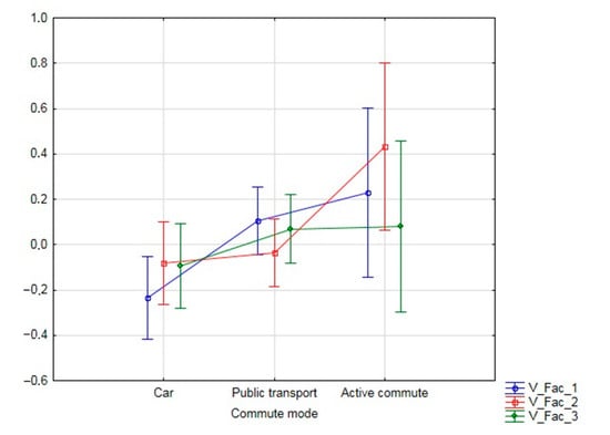 Afterward, a multivariate analysis of variance was applied to verify the differences in the intensity of the three latent factors representing different values connected with traveling. The dependent variables were the three factors previously identified, and the categorical variable was the commute mode of choice. The results of the analysis are shown in Figure 2. The graph presents how the respondents agree with the three factors representing different travel-related values: quality and entertainment (V_Fac_1), comfort and unlimited mobility (V_Fac_2), as well as environmental friendliness (V_Fac_3). The Wilks Lambda was equal to 0.94, resulting in a p-value of 0.001, meaning that there are statistically significant differences between the users of different commute modes when it comes to the travel-related values treated as a whole. Specifically, the post hoc analysis revealed there are differences in the second factor representing the importance of travel comfort and flexibility. Interestingly enough, active commuters are characterized by much higher values of that factor than the people traveling by car or using public transport, meaning they value comfort and flexibility the most.