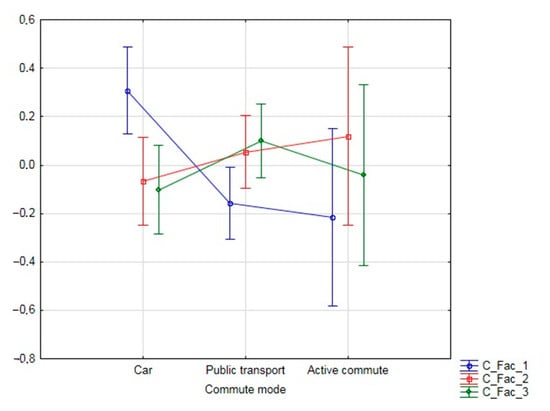 The graph shows which characteristics of the car are most important to the users of the three main commute modes. The values are represented by three factors, grouping the values together. The first factor shows the desire for the car to be luxurious and entertaining (C_Fac_1), the second one shows the economical values—the car’s reliability and low use cost (C_Fac_2), while the third factor shows the car’s greenness and safety. There are statistically significant differences between the value attributed to the different types of car features depending on the main commute mode, as proven by a Wilks Lambda of 0.93 with a p-value of 0.002. The post hoc analysis revealed statistically significant differences in the values of the first factor representing the luxury and entertainment associated with driving a car. The respondents who actually drive a car as their transport mode of choice are characterized by much higher values of this factor, meaning that they attribute much higher values to the cars’ luxurious features than the respondents who travel by public transport or prefer active transport modes. The Levene’s test proved that the variances are homogenous (p-value = 0.65), and the M Box test proved that the covariance matrices are equivalent (p-value = 0.36), thus proving the statistical validity of the results.