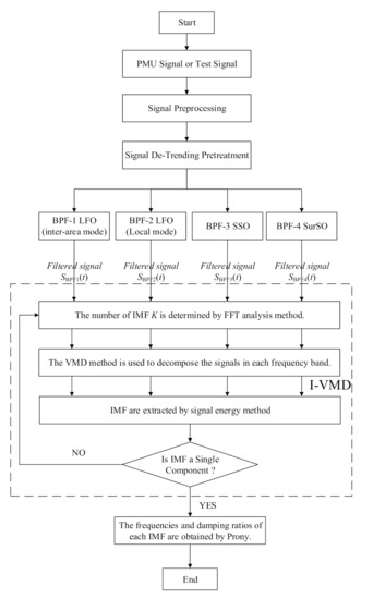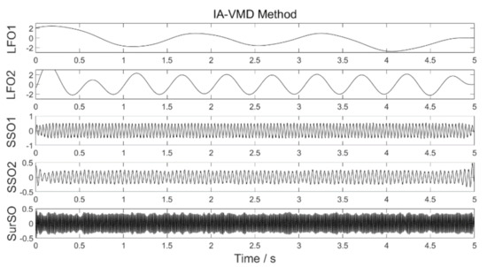 As shown in Figure 2, the bandpass filter (BPF) method preliminarily decomposes the original input signal according to the frequency range of the LFO interval mode, the LFO local mode, subsynchronous oscillation (SSO), and supersynchronous oscillation (SurSO). The intrinsic mode function of each frequency band signal can be obtained by the IA-VMD method. Finally, the frequency, damping ratio, and oscillation amplitude of each IMF can be extracted by the Prony algorithm.