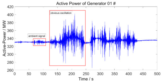 The actual oscillation signal collected from the real power grid is shown in Figure 5. When the system runs to 130 s, an obvious oscillation signal appears. After 20 s, the oscillation diverges rapidly, and the power grid alarms at the same time. After 170 s, the oscillation begins to attenuate, later returning to normal. Before the obvious oscillation of the system occurs, there is a small amplitude fluctuation in the system between 70 and 120 s. However, at this time, the system considers that the ambient data are generated by the normal electrical operation of the power grid and does not give an alarm, and the system has a significant disturbance approximately 20 s after the noise-like attenuation. The data interval between the ambient signal and the obvious oscillation signal is shown in Figure 5. Considering the possibility of broadband oscillation, the sampling frequency of the signal is 100 Hz in this paper.