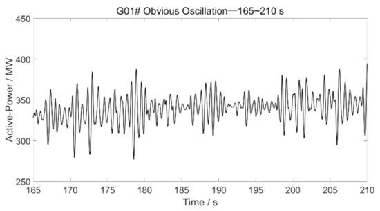 The data can be classified into normal data and abnormal data. Ambient signals are a type of normal data, while oscillation signals are a type of abnormal data. The ambient signals of 65–110 s and the obvious oscillation signals of 165–210 s are selected as the research objects, and the operation characteristic modes are identified by the method proposed in this paper. The obvious oscillation signal is shown in Figure 6, and the ambient signal is shown in Figure 7.
